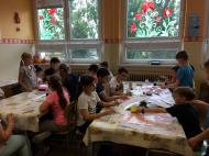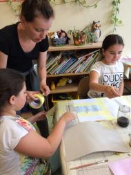 Most egy teljesen új technikát hozott és mutatott be a gyerekeknek. Bio festékkel festettek – káposzta, cékla, tealével – különböző felületű és típusú papírokra. Az eredmény nagyon érdekes, nem mindennapi lett. A gyerekek nagy izgalommal próbálgatták a bio festékeket, lekötötte őket az új festésmódszer, festékanyag.