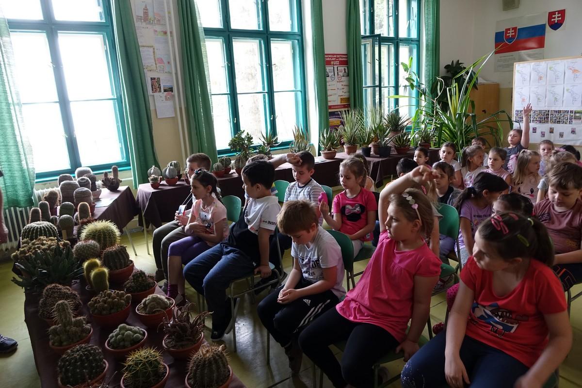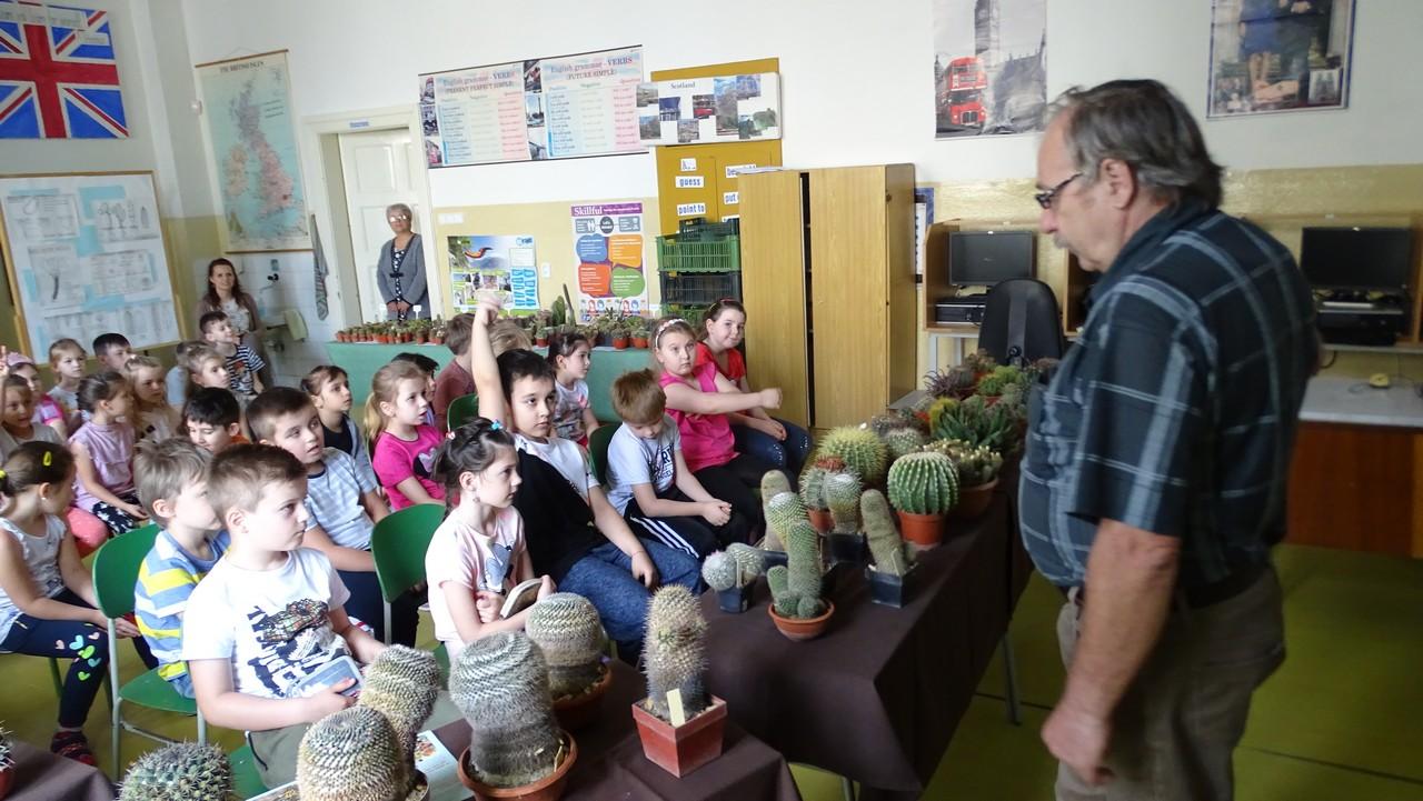 Fábián László, az érsekújvári Saguaro kaktuszklub elnöke érkezett a gyerekek közé. A legkisebbeknek - 1.és2.évfolymos tanulóknak - mesélt e növényről. Az előadását kiállítás is gazdagította, egyes kaktuszokat a gyerekek meg is vásárolhatták.