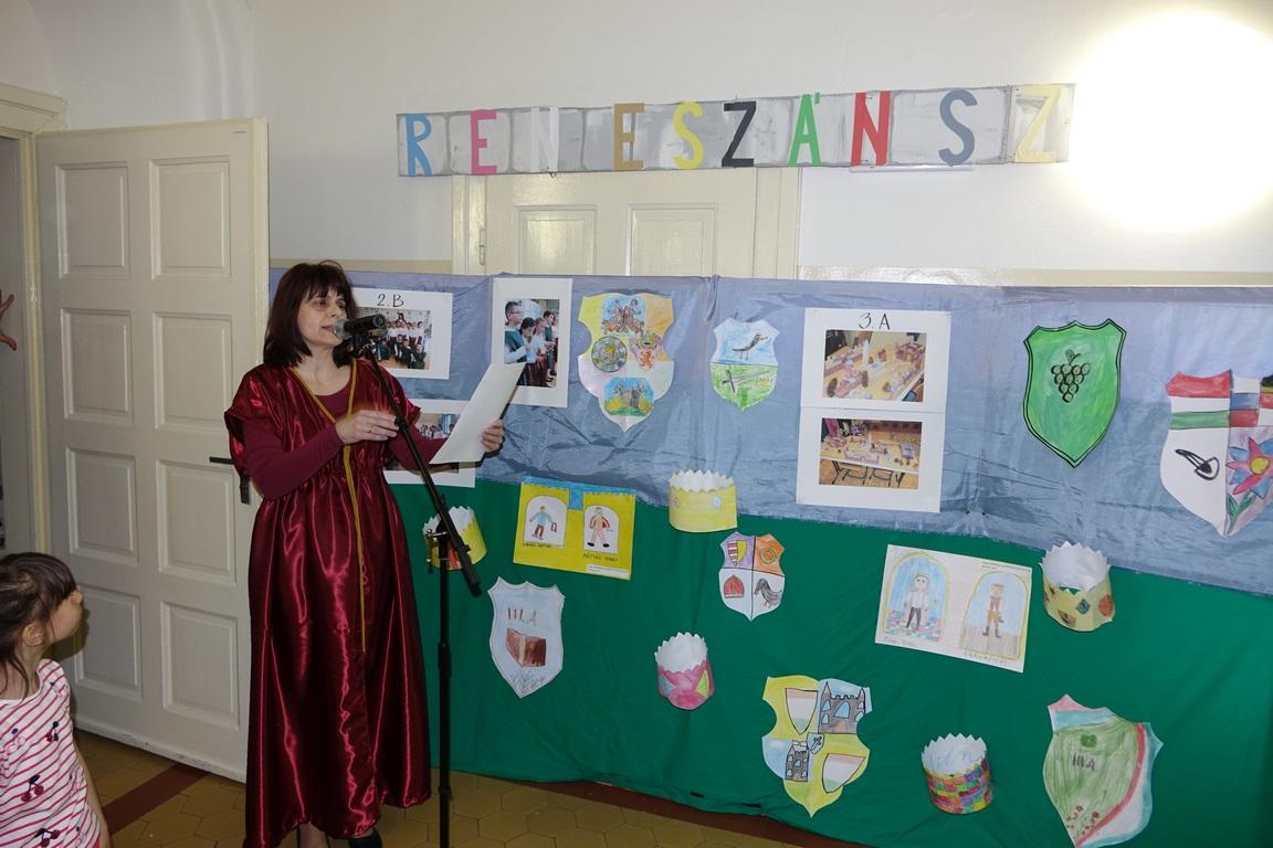 Az alsó tagozaton a húsvéti szünet után projektnapokra került sor. Az osztályok már korábban is foglalkoztak a reneszánsz korral: Mátyás királyról szóló meséket néztek, olvastak és játszottak el, korabeli zenét hallgattak, ismerkedtek a kor építészetével, fegyvereivel, táplálkozási szokásaival és egyéb ismertetőjegyeivel. A projektnapok során minden osztály készített egy rájuk jellemző címert. Gyártottak pajzsokat, koronákat, kardokat, zászlókat, mesebábokat, családi címereket, rajzoltak, festettek, várat emeltek, maketteket készítettek és táncot tanultak. Az utolsó nap legizgalmasabb eseménye a lovagi torna volt, ahol korabeli ügyességi játékokban mérhették össze az erejüket. A kor szellemét az a közös kiállítás tükrözi, ahol a projektnapok során készült szép munkák tekinthetők meg . Ennek ünnepélyes megnyitójára május 2-án reggel került sor és az 1. emeleti folyosón található.