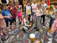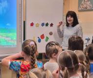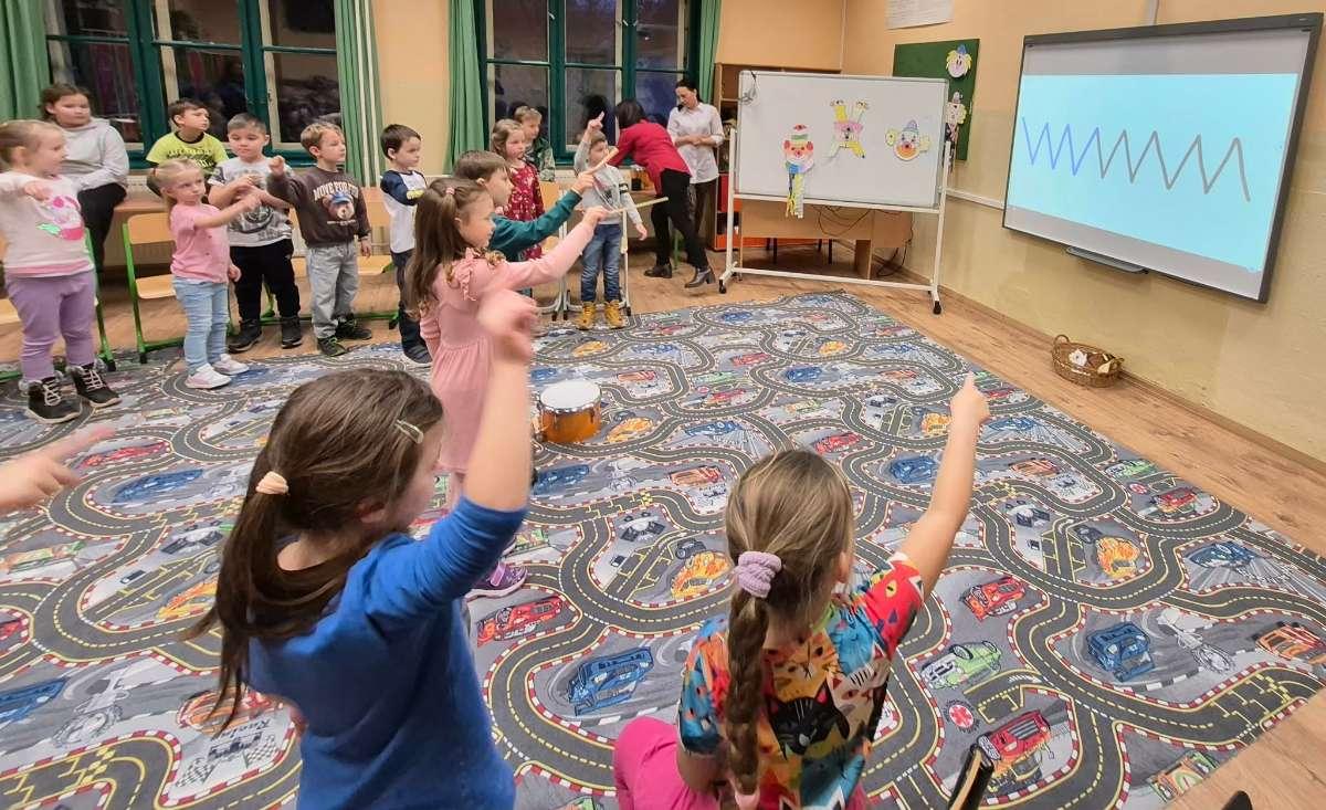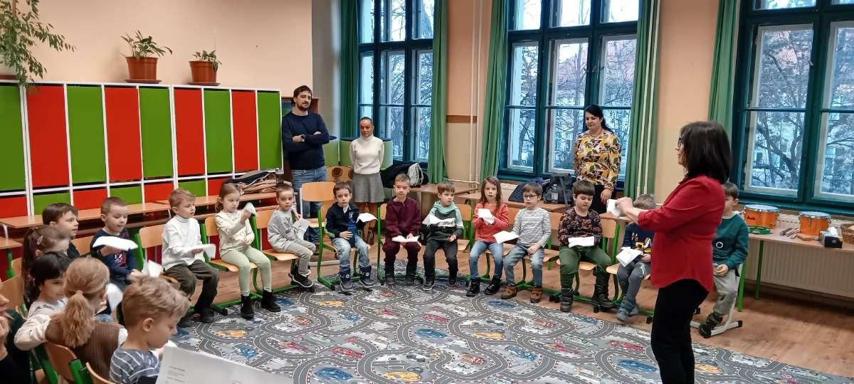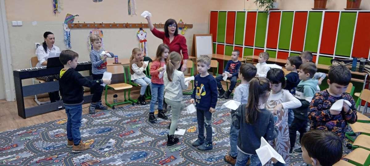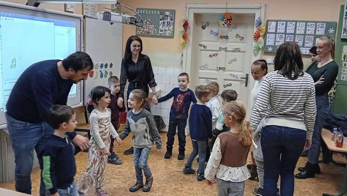 A késő délutáni órákban a tanító nénik két csoportra osztották a gyermekeket, akik így két külön, játékos foglalkozáson vehettek részt: az egyik csoportban köszöntötték egymást, bemutatkoztak, majd szlovák nyelven mondták a színeket és a gyümölcsöket. Interaktív játékokat játszottak, hangjuk alapján ismerték fel az állatokat, a foglalkozást pedig közös tánc zárta. Búcsúzóul minden kis óvodás egy plüss mackót kapott ajándékba. A másik foglalkozás egy vidám élményjáték keretében zajlott, ahol télből farsangba „utaztak” a gyerekek. Mozgással, énekkel, hangszerhangokkal és körjátékkal ébresztették fel a farsangot. A gyermekek aktívan, örömmel és lelkesedéssel kapcsolódtak be a közös játékba – valódi öröm volt együtt játszani.