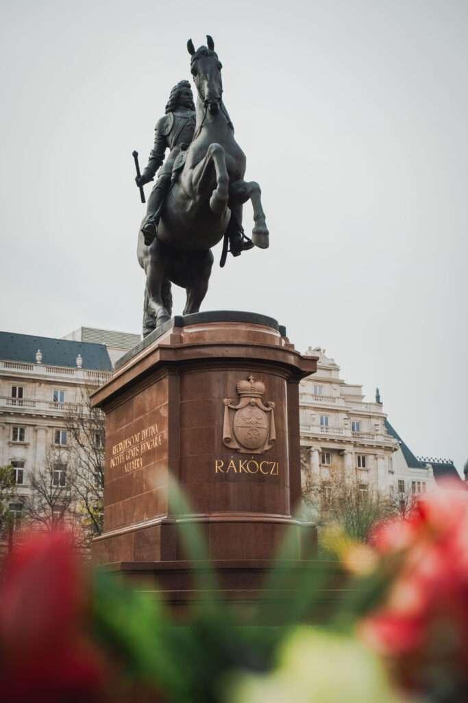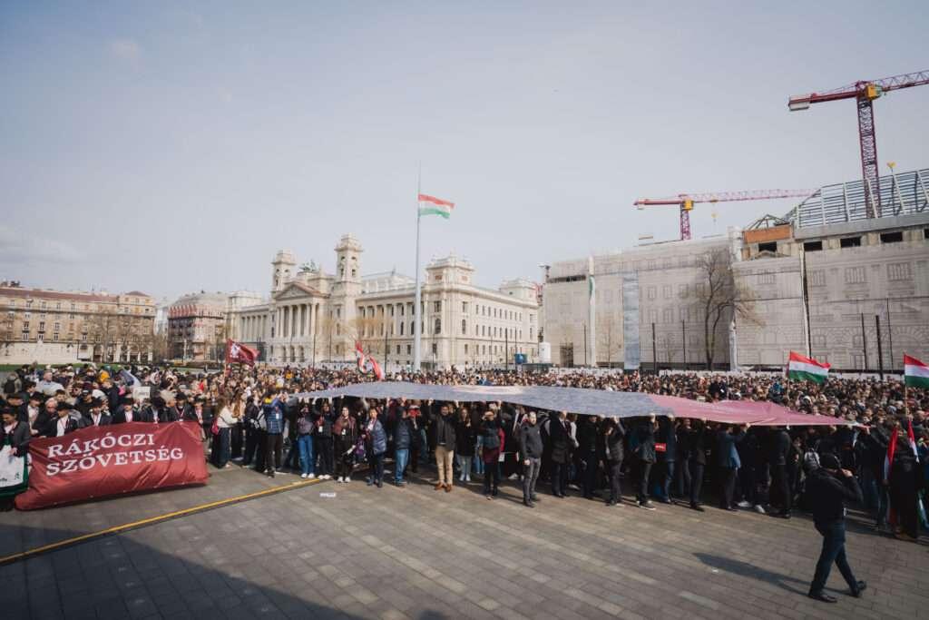 Ezután megkoszorúztuk a Rákóczi lovasszobort, ami számunkra nagyon megható pillanat volt. A Kossuth téren a program végén egy hatalmas molinót is kifeszítettünk, amely rengeteg diák fényképéből állt össze, és így rajzolódott ki II. Rákóczi Ferenc arcképe.