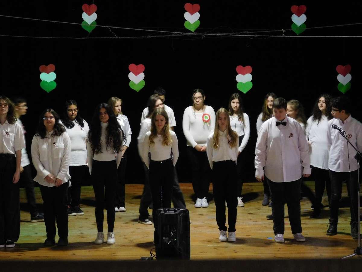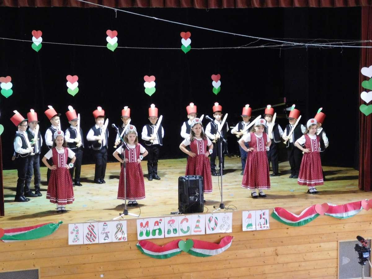 Az ünnepi megemlékezés a Csemadok épülete előtt álló Czuczor-szobornál kezdődött. Dóczé Viktor (9. B, felkészítő: Illés Ildikó) szavalata után Priskin Zoltán igazgató úr mondott beszédet. Névadónk szobrának megkoszorúzását és a Szózatot követően az ünnepség a Csemadok épületében folytatódott, ahol fellépett az alsó tagozatos napközis gyerekekből álló énekkar, Kottlár Albertus Karin tanítványai. Ezt követte az I. B-seket tömörítő Napraforgó néptánccsoport fergeteges tánca, amelyet Dékány Anett és Huszlicska Ágnes tanított be. A 8. A -sok műsorából kiderült, miért és hogyan kell forradalmat "csinálni", a 8. B -sek pedig egy Petőfi újvári tartózkodásáról szóló legendát vittek színre Benyovszky Ágnes irányításával. Galla Katalin a kétszáz éve született Petőfi Sándor életútját vázolta fel, az egyes osztályok tanulóinak közös szavalata segítségével. A megemlékezést a Himnusz eléneklése zárta.