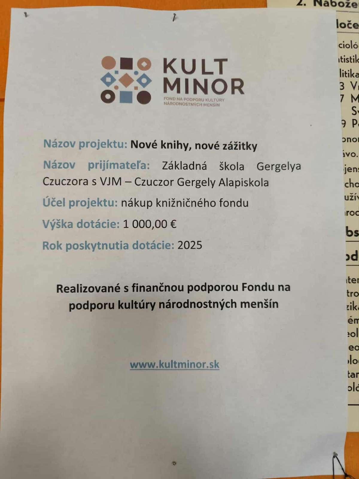 Projekt rozšírenia knižničného fondu školskej knižnice Základnej školy Gergelya Czuczora bol úspešne zrealizovaný
