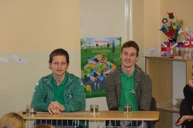 Városunk jégkorongcsapatában vendégeskedik két fiatal kanadai játékos, Patrick Kudla és Mathieu Henderson. November 28-án ellátogattak iskolánk harmadikos és negyedikes tanulóihoz. Kötetlen beszélgetés formájában zajlott a rendhagyó óra. A gyerekek bátran kérdezgettek és figyeltek a válaszokra, amikor szükséges volt tanítói segítséget kaptak.A legbátrabbak több kérdést is feltettek.